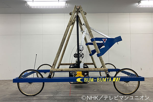 脚立でありながらもがむしゃらに走る姿はまさに爆走するモンスター。キャタツーリングを生で見るとテレビとは違う大迫力の走りを見せてくれます。飛び跳ねるほどの世界一のパワフル脚立をぜひ間近でご覧頂くと共に、トイレットペーパーの飛行機雲(コントレイル)のように飛んでいく美しい姿は一番の見どころ。計算されたセッティングから絶妙なタイミングで動いていくハラハラ感と発射する瞬間の迫力とあわせてご覧下さい!