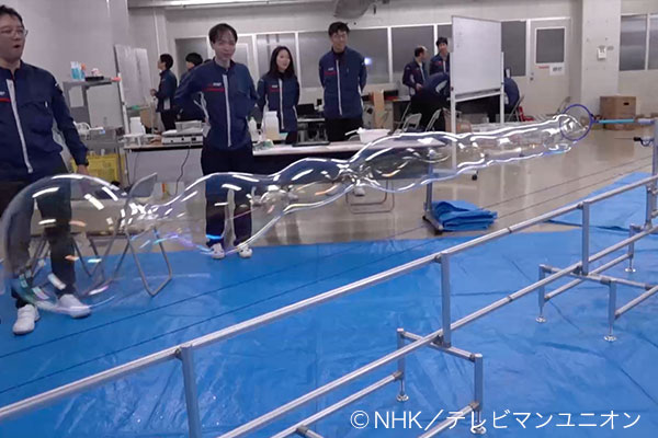 M菱電機製の魔改造マシン「膜張りまっせ」でシャボン玉ロープシャボン玉伸ばし走を実演します。安定感抜群の足回りと人間の腕のような動きで、美しいシャボン玉を生み出し続けます。走行中も角度を微調整する驚異の制御は必見!若手研究者の探求心を存分に込めたモンスターをぜひお近くでご覧ください。